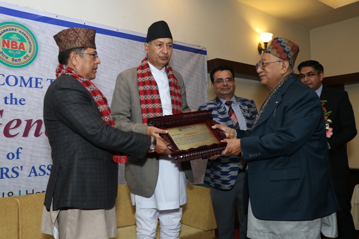 During the AGM function, the Chief Guest of the program, Honorable Minister Dr. Yuva Raj Khatiwada; Special Guest Dr. Chiranjibi Nepal, Governor, Nepal Rastra Bank and Mr. Gyanendra Pd. Dhungana, President, NBA jointly presented Mr. Shrestha with a memento in recognition of his significant contribution in the banking and financial sector of Nepal.